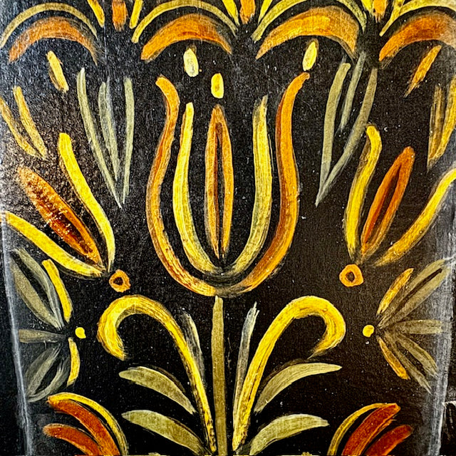 Bittersweet and pumpkins fill a tole painted tin on this striking black breadboard style board. Completing the scene is a vintage candle stick with tallow candle.
