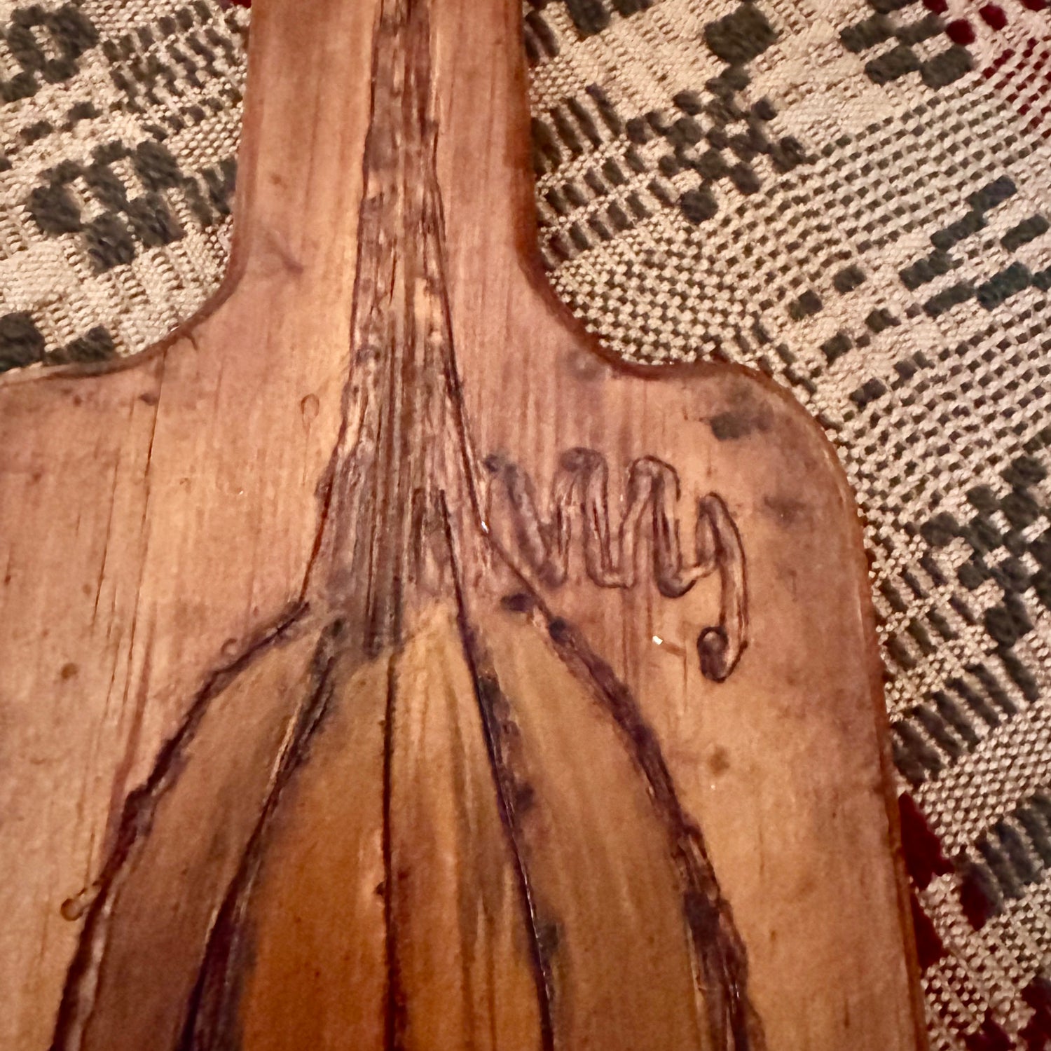 Ann has taken a paddle shaped board and painted it for two seasons. One side is a primitive snowman and the other a pumpkin. The pumpkin has carved lines and a rusty attached star. Paddle measures approximately 18 inches high and 5 inches wide.