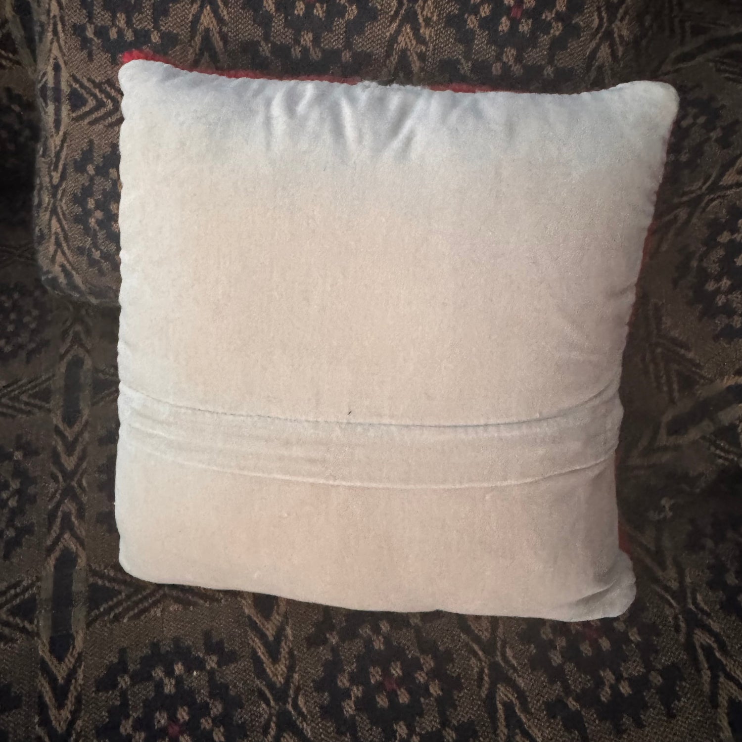 A simple graphic of Santa’s belt is the design for this small red wool hooked rug style pillow. A charming addition for your holiday décor to display on a sofa or chair or as a gift for friend or family.