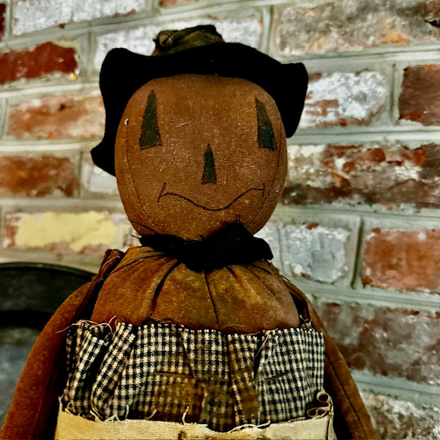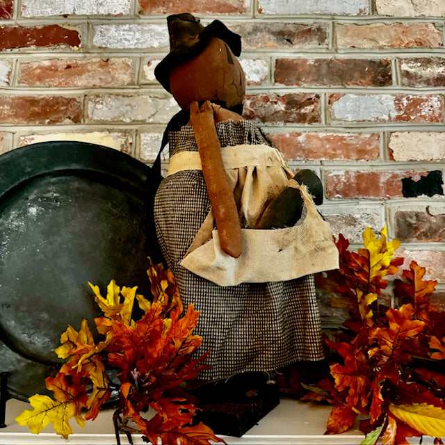 A full body standing pumpkin girl dressed in black check, wearing an apron with crow and dried gourd.